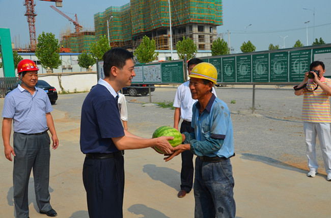 信陽市經(jīng)過前段時(shí)間的強(qiáng)降雨后,近期卻是持續(xù)的高溫天氣,驕陽似火,夏日炎炎,室外氣溫高達(dá)36℃以上,對(duì)于施工現(xiàn)場作業(yè)的農(nóng)民工來說是對(duì)體力和毅力的挑戰(zhàn)。針對(duì)這一情況,2013年8月2日上午9:00,信陽市總工會(huì)由李強(qiáng)書記帶隊(duì)的慰問小組頂著炎熱的烈日,到我公司龍?jiān)疵讽?xiàng)目部去看望施工現(xiàn)場的農(nóng)民工,為我公司戰(zhàn)斗在施工生產(chǎn)一線的農(nóng)民工送來了防暑降溫的物品。