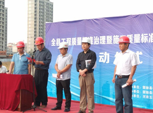 9月25日上午,由固始縣建設(shè)工程質(zhì)量監(jiān)督總站和固始縣建委承辦的全縣工程質(zhì)量標(biāo)準(zhǔn)治理暨施工質(zhì)量標(biāo)準(zhǔn)化觀摩活動(dòng)啟動(dòng)儀式在我公司承建的固始縣婦幼保健醫(yī)院項(xiàng)目施工現(xiàn)場(chǎng)隆重舉行。固始婦幼保健醫(yī)院業(yè)主、固始縣建設(shè)局、固始縣建設(shè)工程質(zhì)量監(jiān)督總站領(lǐng)導(dǎo)班子成員、固始各房地產(chǎn)開發(fā)公司負(fù)責(zé)同志以及縣各施工單位等有關(guān)人員共計(jì)200余人參加了儀式。
