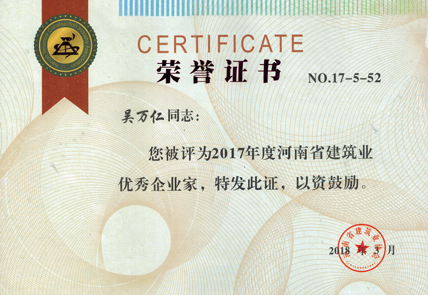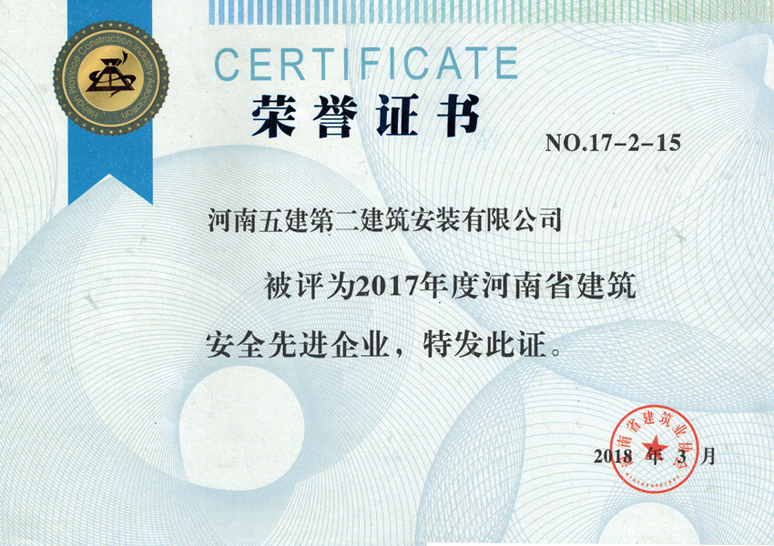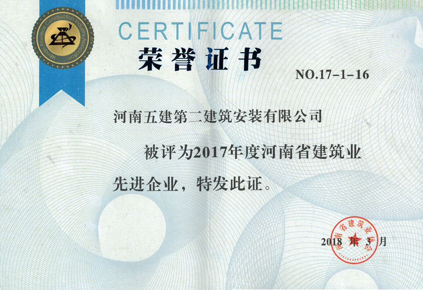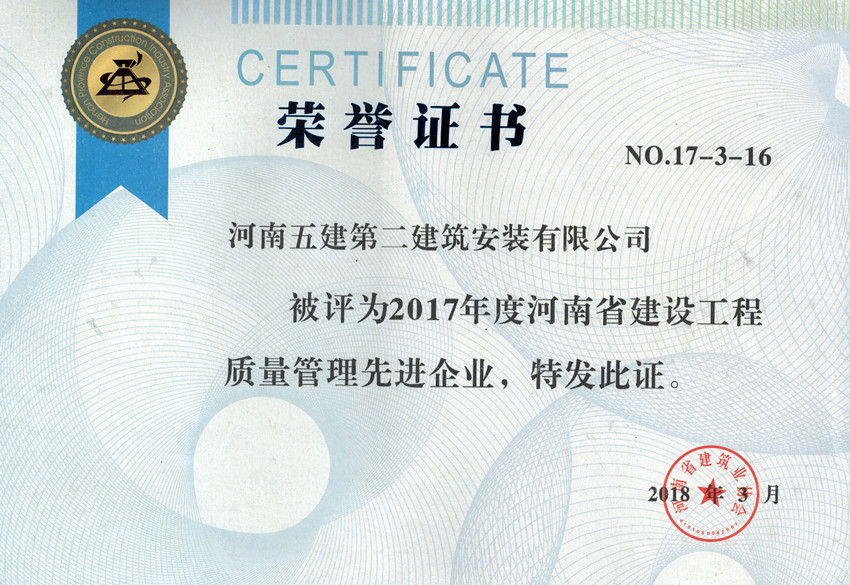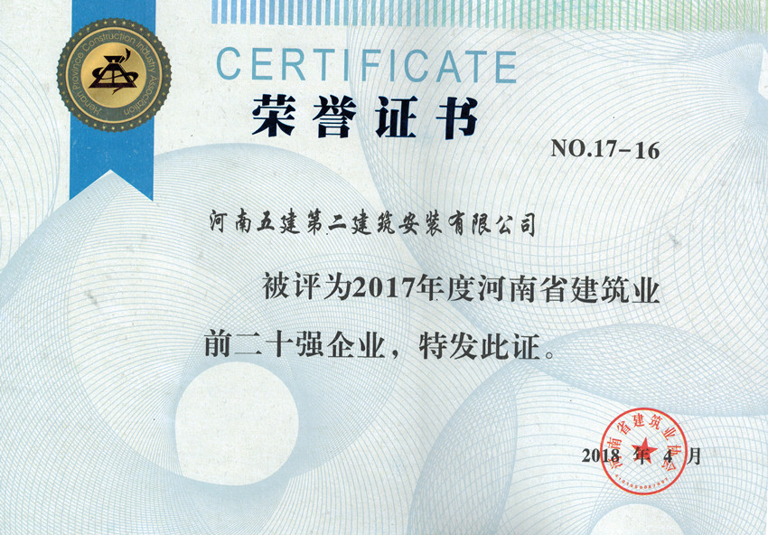 公司榮獲 2017年度“河南省建筑業(yè)前二十強(qiáng)企業(yè)”、“河南省建筑業(yè)先進(jìn)企業(yè)”等多項(xiàng)榮譽(yù)