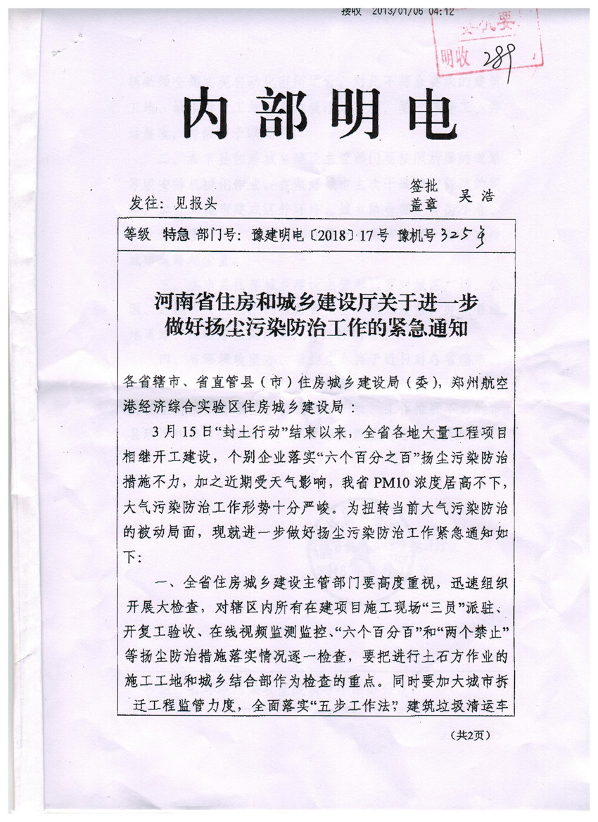 現(xiàn)將《河南省住房和城鄉(xiāng)建設(shè)廳關(guān)于進(jìn)一步做好揚(yáng)塵污染防治工作的緊急通知》(豫建明電[2018]17號)轉(zhuǎn)發(fā)給你們,請按照通知要求,認(rèn)真貫徹執(zhí)行。