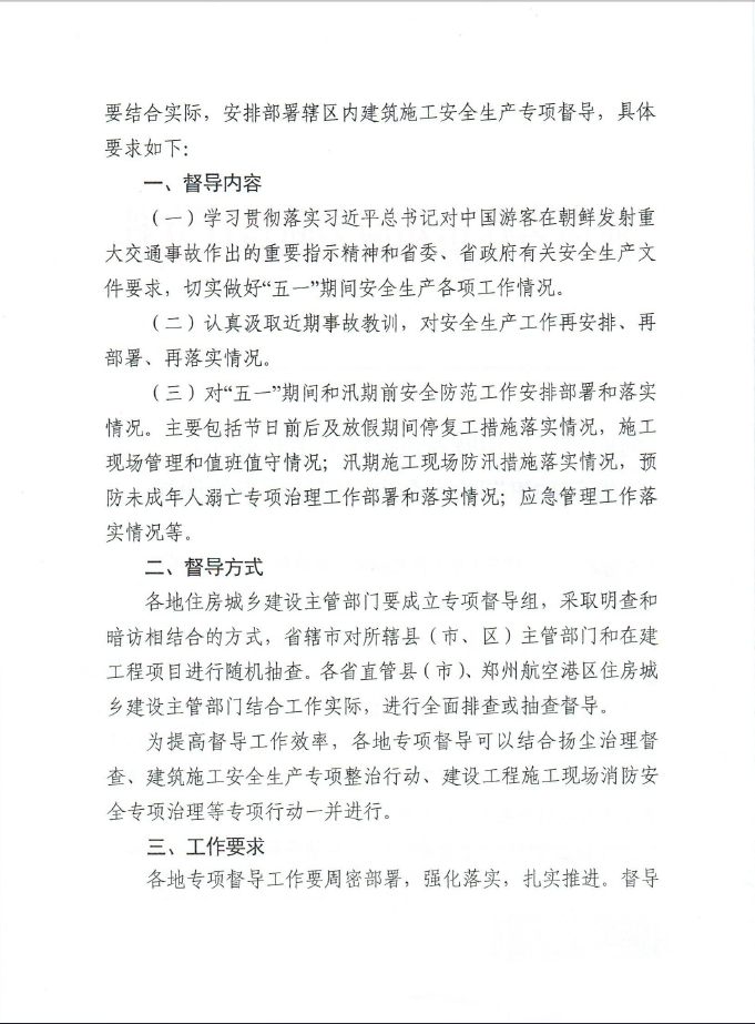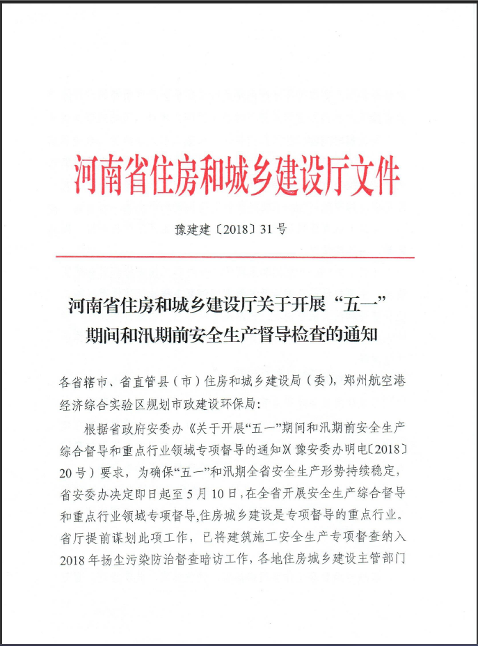 河南省住房和城鄉(xiāng)建設廳關于開展“五一”期間和汛期前安全生產(chǎn)督導檢查的通知