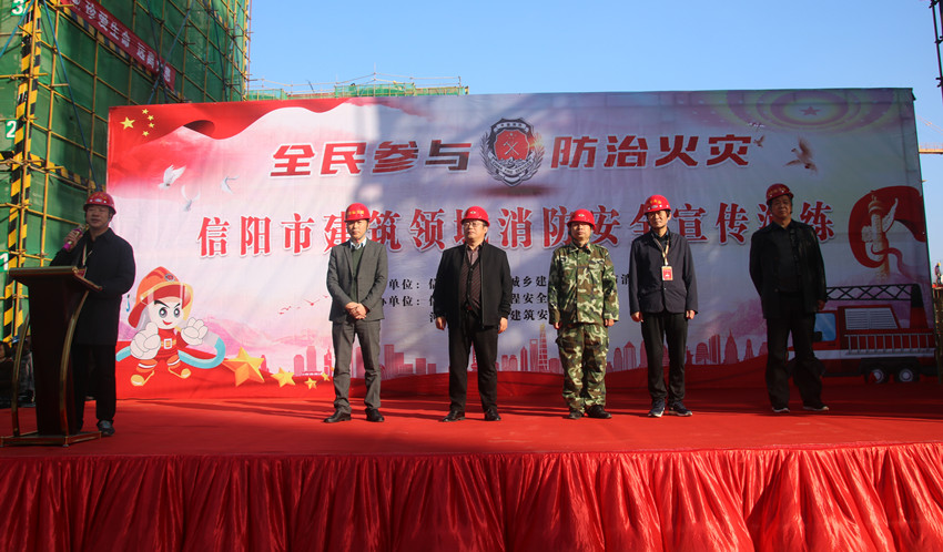 此次活動(dòng)由信陽(yáng)市住建局和信陽(yáng)市消防支隊(duì)聯(lián)合主辦,由公司和信陽(yáng)市安監(jiān)站共同承辦,信陽(yáng)市住建局分管副局長(zhǎng)張奔、信陽(yáng)市安監(jiān)站站長(zhǎng)馬其峰、副站長(zhǎng)楊傳臣、信陽(yáng)市消防支隊(duì)消防專(zhuān)家陳波等領(lǐng)導(dǎo)參加活動(dòng),公司董事長(zhǎng)、總經(jīng)理吳萬(wàn)仁、副總經(jīng)理吳建功出席活動(dòng)。活動(dòng)由信陽(yáng)市安監(jiān)站站長(zhǎng)馬其峰主持,張奔局長(zhǎng)擔(dān)任總指揮長(zhǎng)。