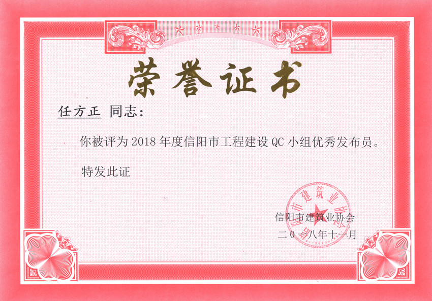 因成績突出,公司被信陽市建協(xié)評為2018年度信陽市工程建設(shè)QC小組活動優(yōu)秀企業(yè),公司BIM中心員工任方正被評為優(yōu)秀發(fā)布員。