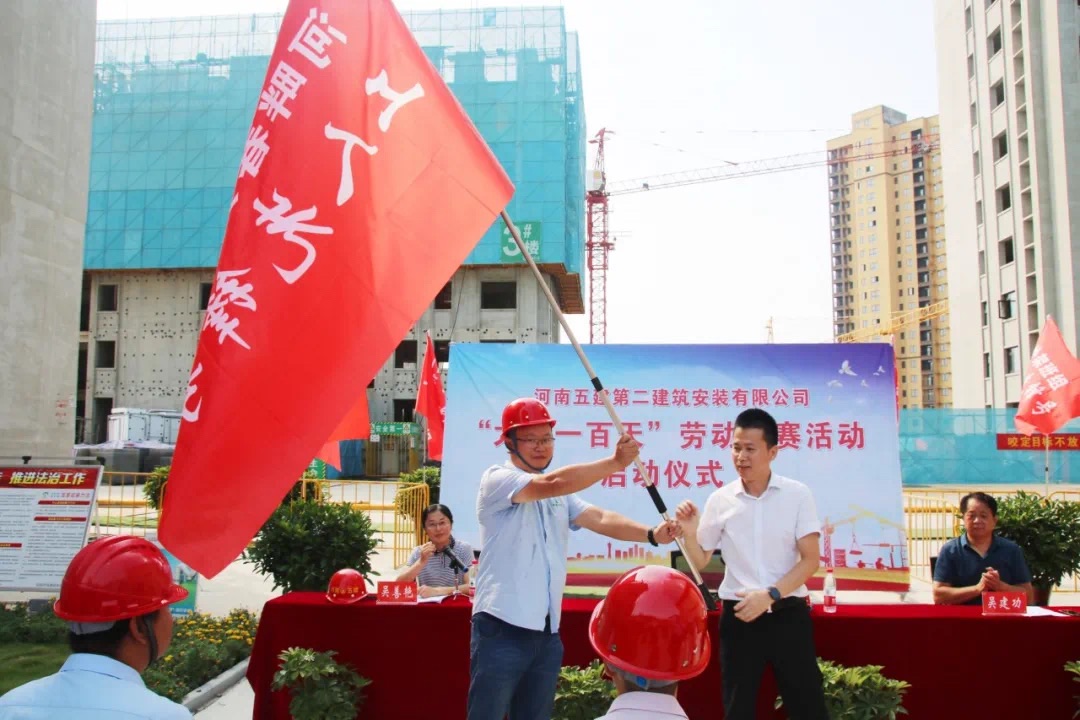 儀式開始后,吳部長首先宣讀了《河南五建二公司在建項(xiàng)目“大干一百天”勞動(dòng)競賽實(shí)施方案》。此次競賽活動(dòng)共有11個(gè)主體在建的項(xiàng)目部參加,公司對此次活動(dòng)高度重視,成立了以吳萬仁董事長為主任的勞動(dòng)競賽組委會(huì),全面負(fù)責(zé)競賽工作的部署、督促、檢查及評比。此外,公司還對本次競賽活動(dòng)的目標(biāo)、范圍、內(nèi)容以及競賽評價(jià)、總結(jié)表彰等工作進(jìn)行了詳細(xì)的策劃和安排。佳和熙岸項(xiàng)目部負(fù)責(zé)人蔡旺軍代表競賽項(xiàng)目部做了發(fā)言,呼吁所有競賽項(xiàng)目要為此次競賽活動(dòng)取得圓滿成功而不懈努力。公司副總經(jīng)理吳建功對競賽活動(dòng)提出具體的工作要求,他在講話中提到此次競賽活動(dòng)的重要意義,要求所有參與者都要提高思想站位,高度重視,各競賽項(xiàng)目、機(jī)關(guān)各部門以及勞動(dòng)競賽組委會(huì)要各專所長、密切配合,充分發(fā)揮創(chuàng)新引領(lǐng)作用,積極完成此次“大干一百天”勞動(dòng)競賽活動(dòng)。